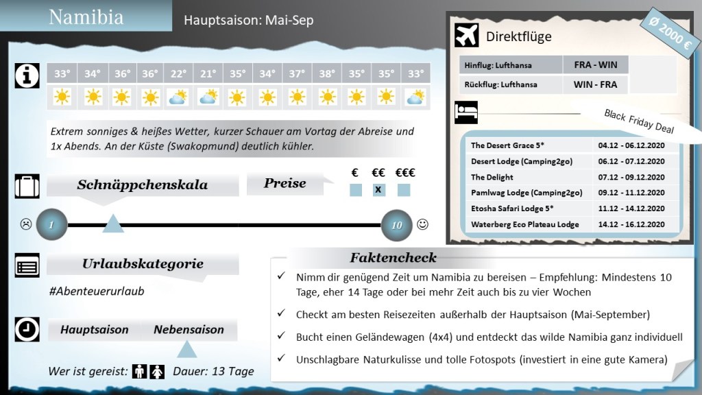 - Fantastische und artenreiche Tierwelt im Etosha Nationalpark – einer der schönsten Nationalparks in Afrika. Ihr benötigt hier definitiv keine geführte Safari und solltet den Nationalpark auf eigen Faust erkunden. Empfehlung: Übernachtung innerhalb des Parks