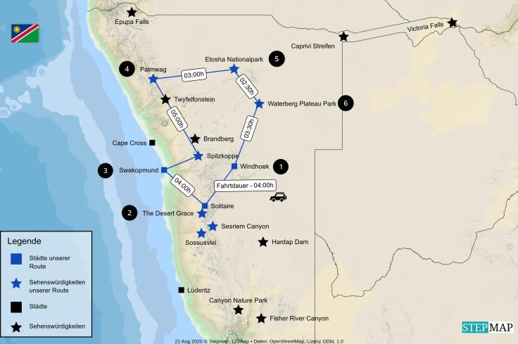 Wir haben aufgrund der verfügbaren Reisezeit auf die Sehenswürdigkeiten im Süden und weiter im Norden verzichtet. Diesen haben wir euch zusätzlich auf der Karte markiert. Nach unseren Erfahrungen würden wir euch eine 3 Wochen Tour inklusive Ausflug in den Caprivi Streifen empfehlen.